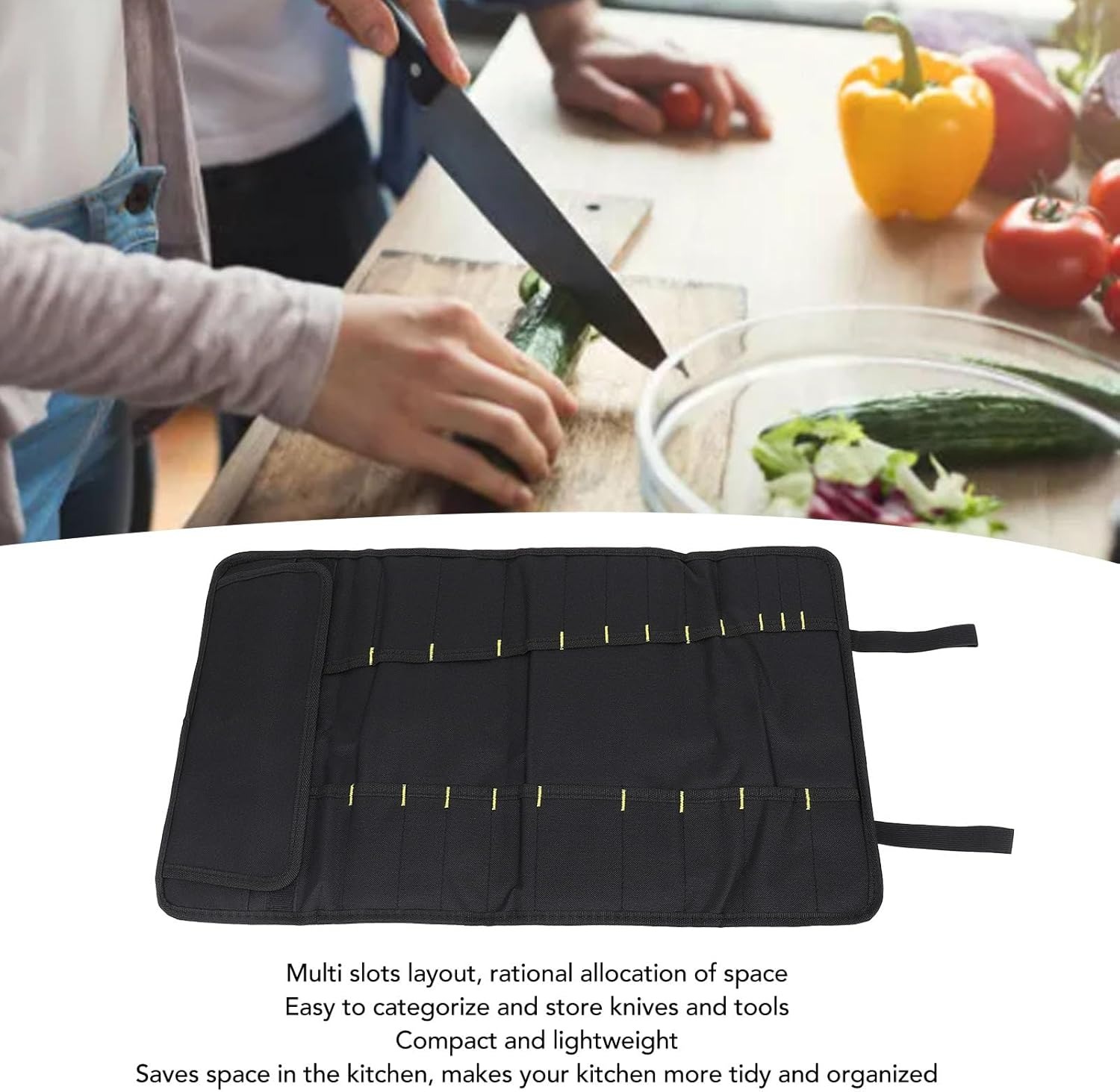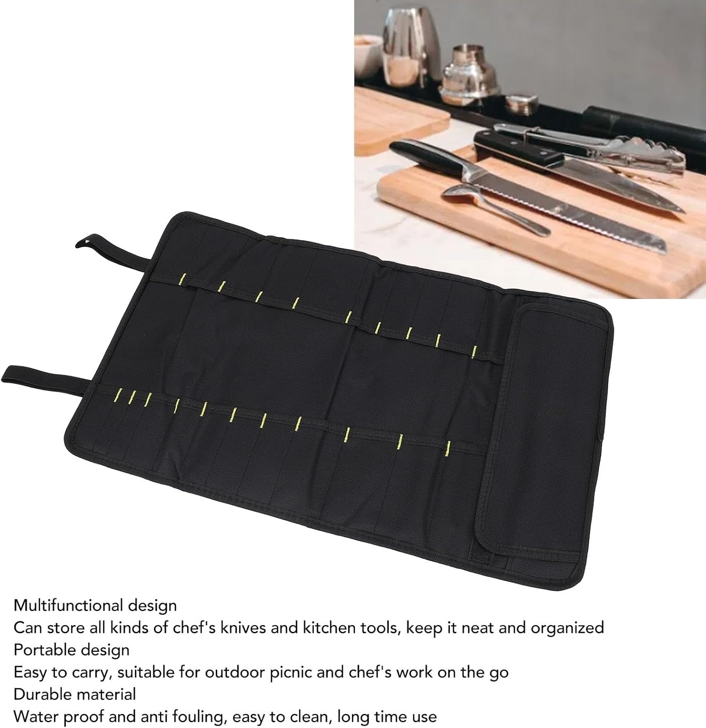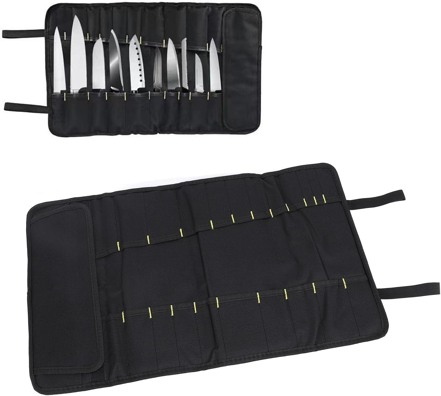 CONVENIENT AND EASY TO CARRY: Designed for chefs, students or home cooks, the chef knife bag is lightweight and portable. It is suitable for carrying knives and utensils at work, school, traveling or camping. Simply load the tools, roll up the bag, buckle and fasten the straps for easy transportation.