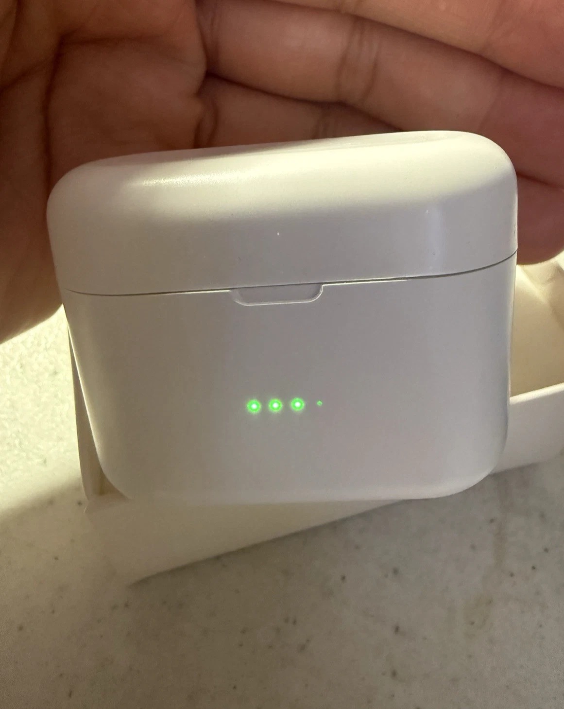 The charging case has indicator markings and slots to securely hold and charge each earbud.