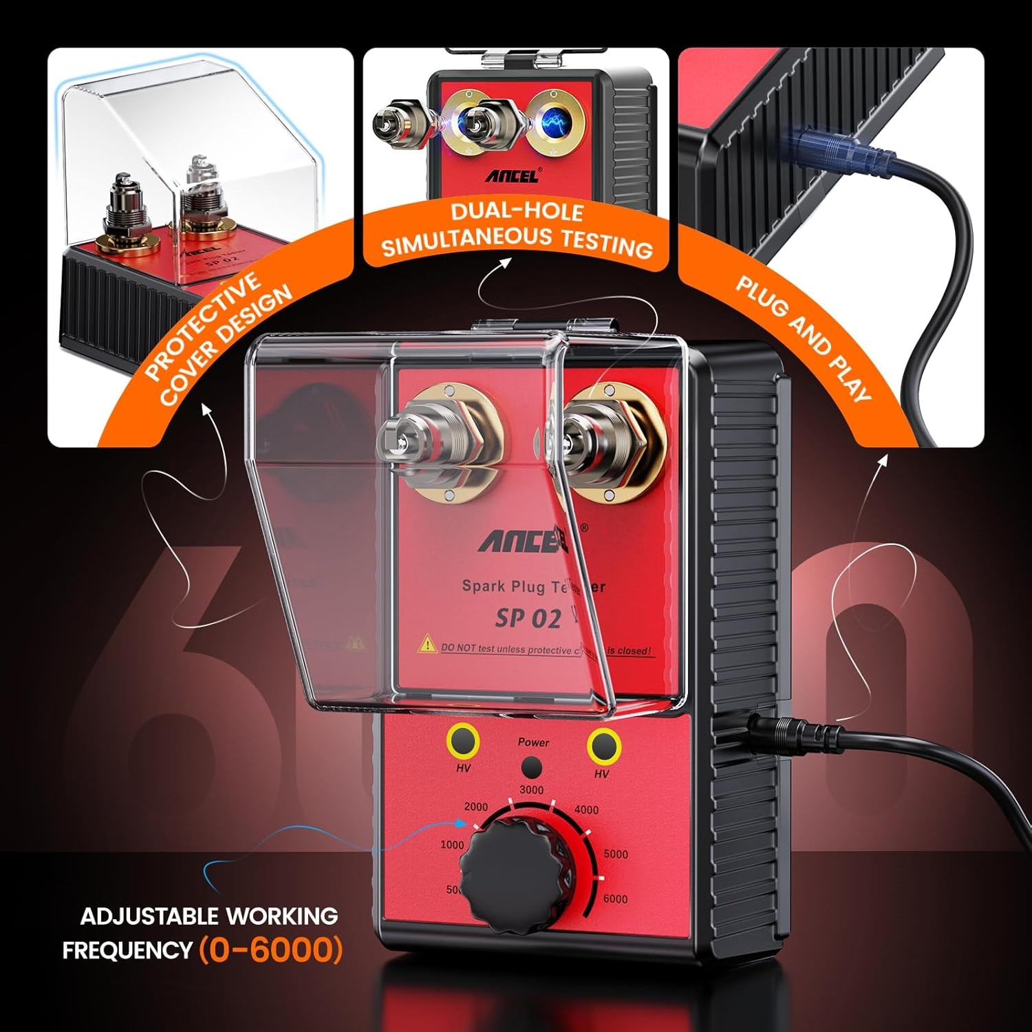 【Test Two Spark Plugs at Once – Faster, Smarter Diagnosis】Why test one at a time? ANCEL SP02 dual-hole spark plug tester lets you compare two plugs side-by-side—instantly revealing weak sparks or misfires. Spot underperforming plugs in seconds and swap them out before they hurt engine performance. Whether you're a seasoned mechanic or a weekend DIYer, this tool helps you tune faster, fix smarter, and keep every cylinder firing strong
