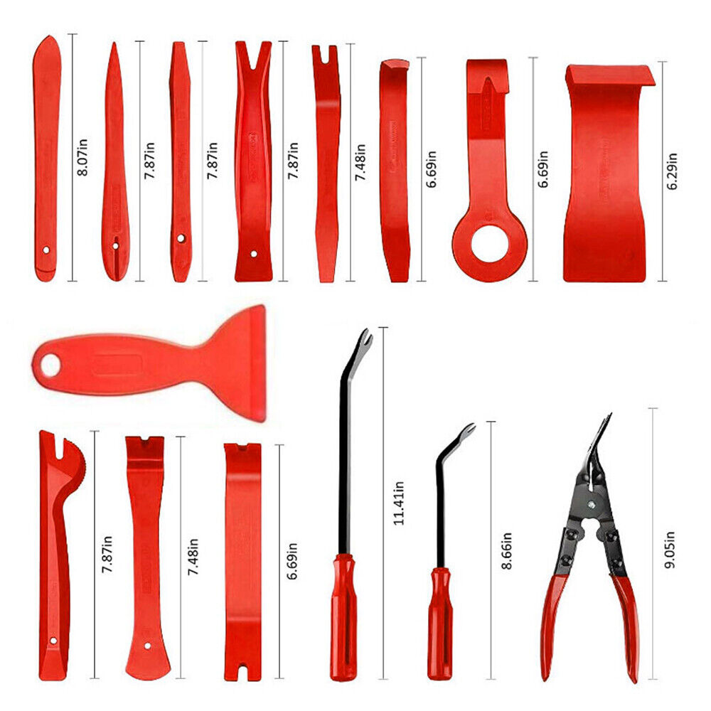 Features: 6 Most Popular Sizes : There are 6 most common sizes of clips which will meet your needs, sturdy and reusable, compatible for GM, Chrysler, Ford, Toyota, Nissan, Mazda. Hyundai, Kia, AMC, Jeep, etc…(Attention:Store in a big Zip lock bag with 6 small bags,not in a box, to ensure the safety of the transportation process and arrive at your hands safely and completely) Multifunctional: Different kinds of door panel removal tools are available for you, excellent for Automotive, Marine, Furniture or Aircraft Trim removal and installation, including Door Panels, Moldings, Window Trims, Clips, Fasteners, Emblems, Panels, Radios, etc... Upgraded Material: Made of impacted resistant nylon fiber material with high-level craftsmanship, it’s non-toxic and durable, would be an excellent choice for you Easy Storage: Come with a portable bag helps you carry all kits and is less prone to loosing, would greatly save your time and space Package Include:158Pcs Trim Removal Tool, Auto Push Pin Bumper Retainer Clip Set Fastener Terminal Remover Tool Adhesive Cable Clips Round Handle Crowbar Pry Kit Car Panel Radio Removal Auto Clip Pliers Specifications: Material: ABS Color: Red Bag size: 32x23x5cm Package: 12 x Prybar for Removing the Plastic Fairing1 x Trim Clip Pliers2 x Upholstery Fixing Remover4 x Precision Hook and Pick Set6 x Stereo Removal Tools2 x U Shape Radio Removal Tools11 x Wire Terminal Removal Tool120 x Retaining Clips1x Storage bag
