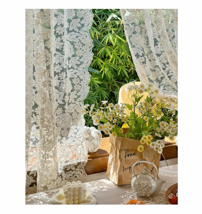 1pc French High-end Vintage Beige Embroidered Gauze Curtains with Wavy Edge