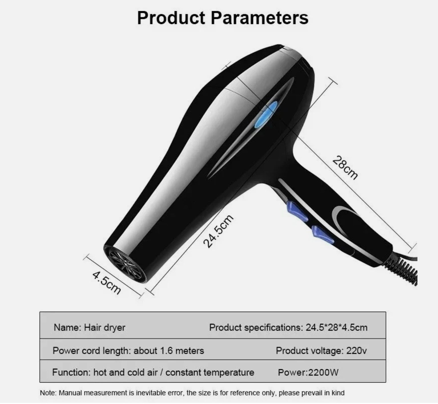 2200W Ionic Hair Dryer Professional Hot Cold Air Blow Dryer with NozzleDetails: