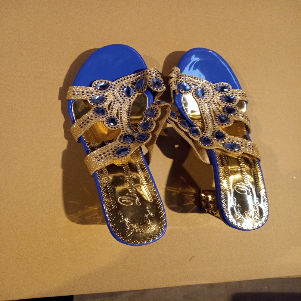 Blue 41 Women’s Summer 2023 Rhinestone Chunky Heel Hollow Casual Beach SlippersDetails: