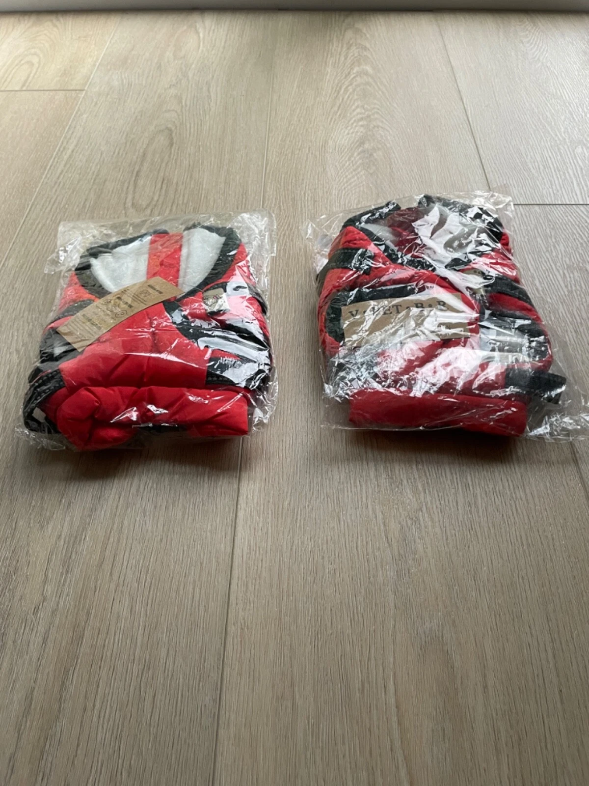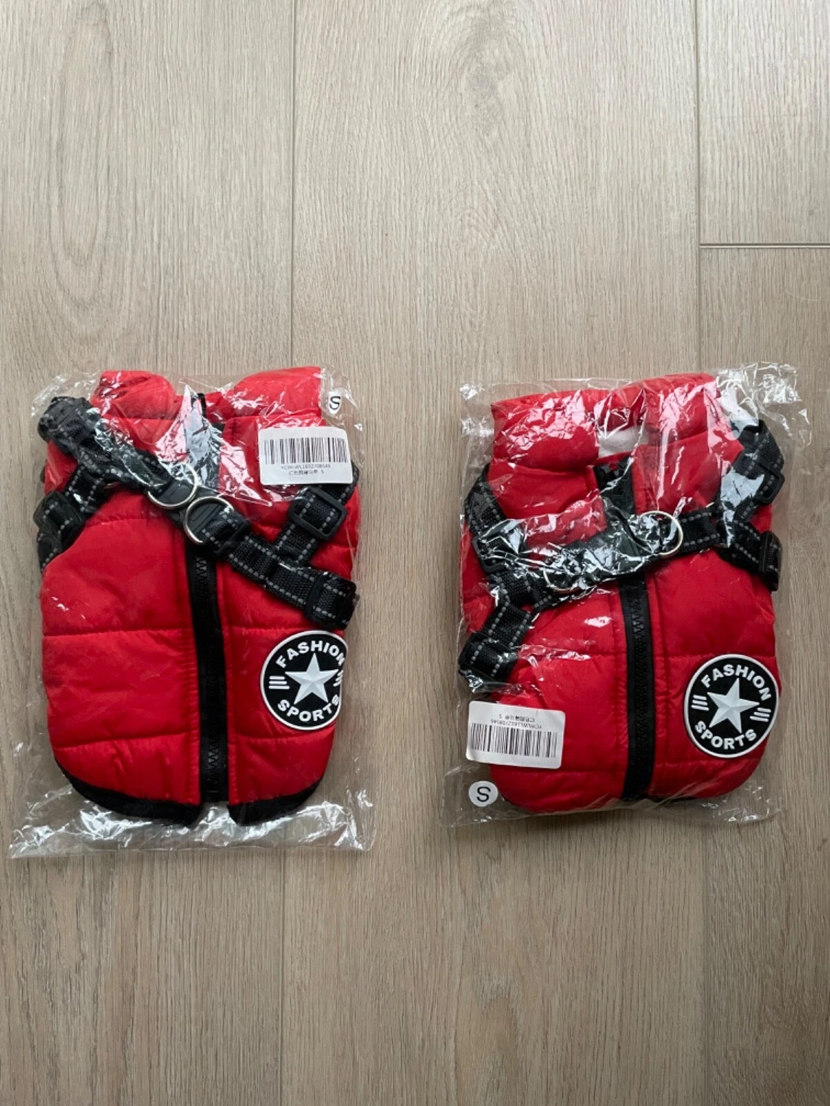 Get your furry friends ready for the winter season with these red Fashion Sports V.PET.B.R winter jacket and harness combo. I have two small dogs that we bought these for but ended up never using and unfortunately we store them away and forget we have them. Trying to off load some stuff so here is two brand new dog jackets still in plastic shipping bags with tags. Brand new and never used, they are winter jackets with a harness in one so you can strap this coat on your small dog, if he/she lets you lol, just hook up your leash and your ready to go.