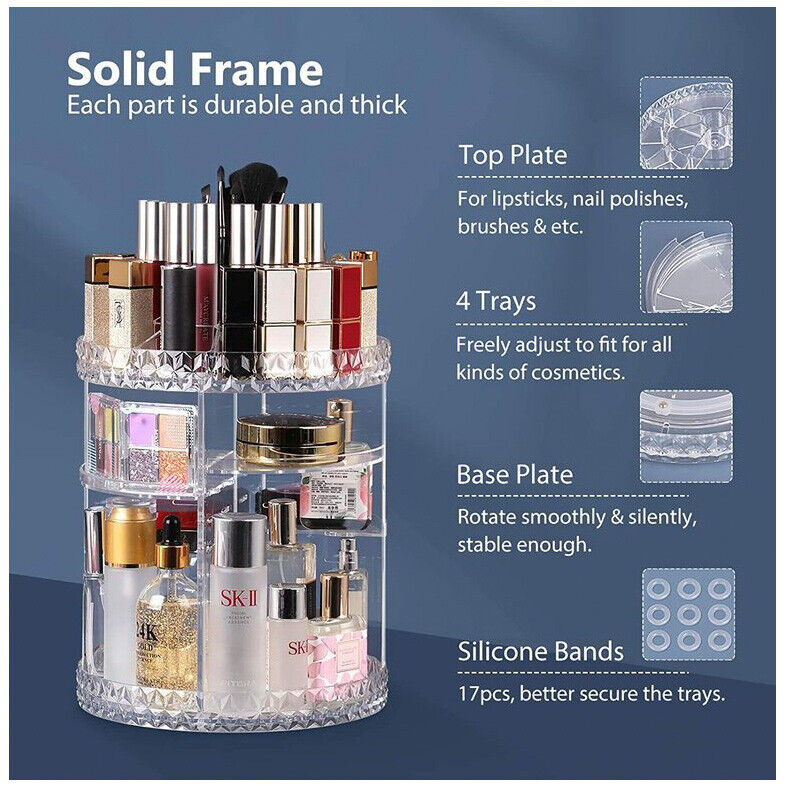 360 Degree Rotation: Perfectly organizes and stores your cosmetics and accessories; easy access to all of your makeup products.
