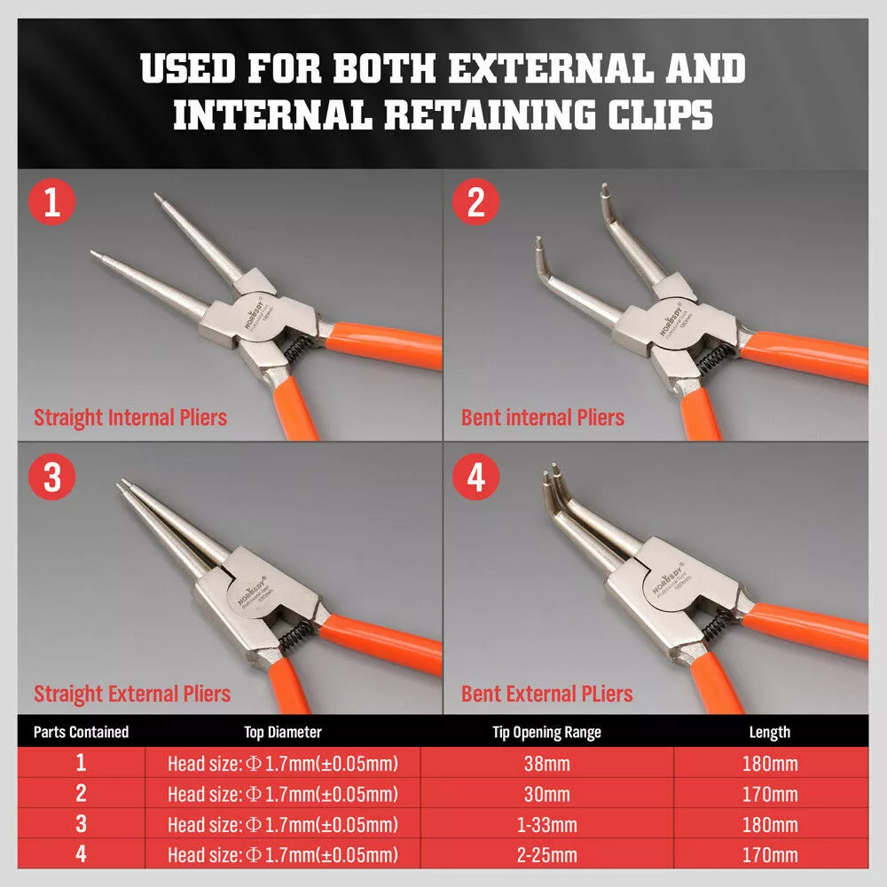 4-Piece 7" Circlip Pliers Set Internal / External / Bent / Straight Ring Remove